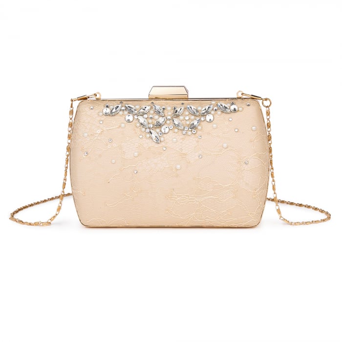 Cu un stil modern și foarte feminin , cu strasurişi dantela care iți ia ochi ideală pentru nunta şi ocazie speciale, se poate purta ca geantă plic sau ca o geantă crossbody . Este o alegere ideală pentru nuntă sau orice ocazie când avem o ținută elegantă. Interiorul este unul singular cu un buzunar . Cureaua de umăr nu este reglabilă.