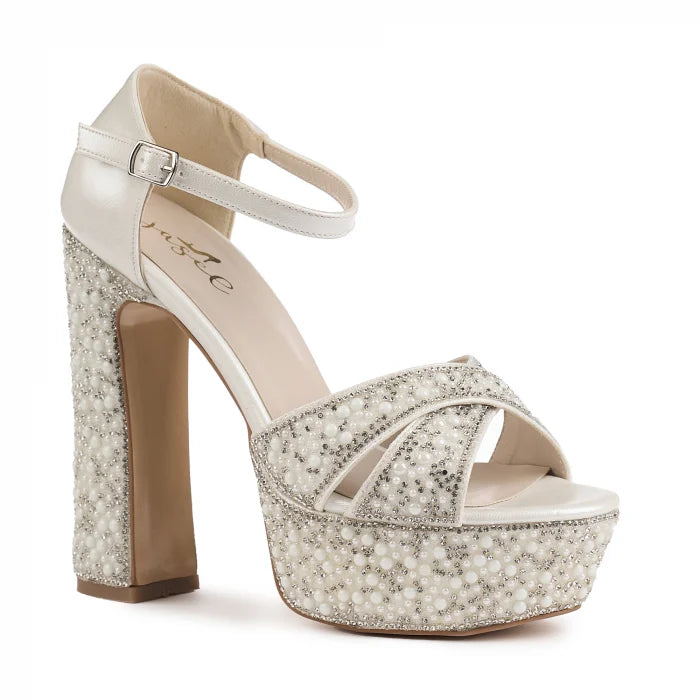 Aceste sandale de mireasă elegante, împodobite cu pietre și perle, adaugă o notă de strălucire și rafinament. Cu un toc de 13 cm, oferă atât înălțime cât și o siluetă alungită. Confortabile și sofisticate, sunt alegerea ideală pentru ziua nunții.