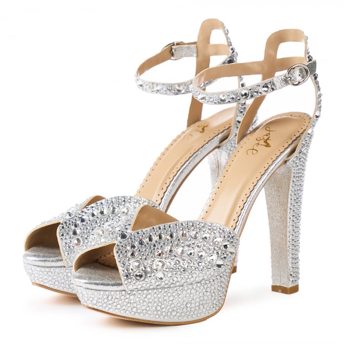 Sandale de ocazie cu decupaj special, de culoare argintiu aceesorizate cu stasuri motiv de diferite dimensiuni atat partea din fata cat si pe baretele din spate si toc.Tocul este de 13 cm iar platforma de 3 cm, talpa antiderapanta, interiorul este facut din piele naturala iar pentru lejeritate au fost adugate si pernute antistres, exteriorul din piele ecologica, sunt usori, moi si lucrati manual.